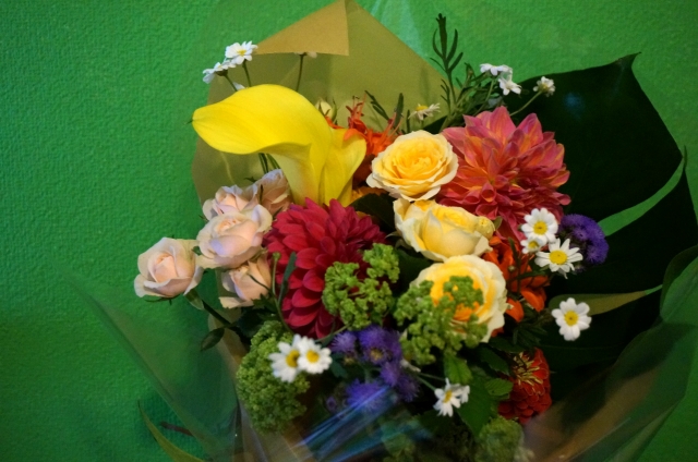 「思い切りカラフルに(^^)」と注文したお花を手土産に友人宅へ。