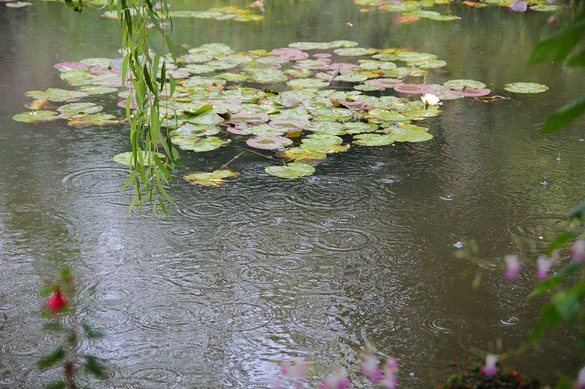 睡蓮の池に落ちる雨の雫でできた丸い輪っか模様。