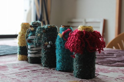 瓶に毛糸を巻き巻きして、あったか一輪挿しの完成。