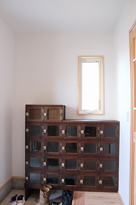 玄関ドアを入るとすぐにレトロな「靴箱」がお出迎え。