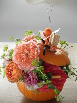 花友さんのブログにワタシがものすごいポーズでカボチャを持ち上げてる