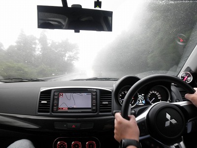 雨のやまなみハイウェイを楽しんで走ってる夫。