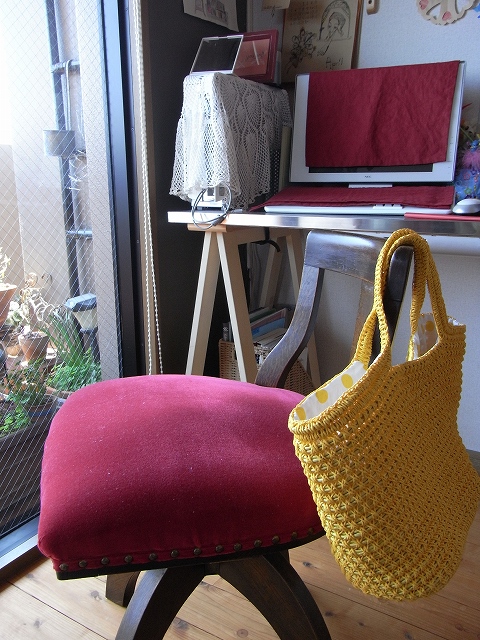PCにも赤いリネンのクロスでホコリよけ。